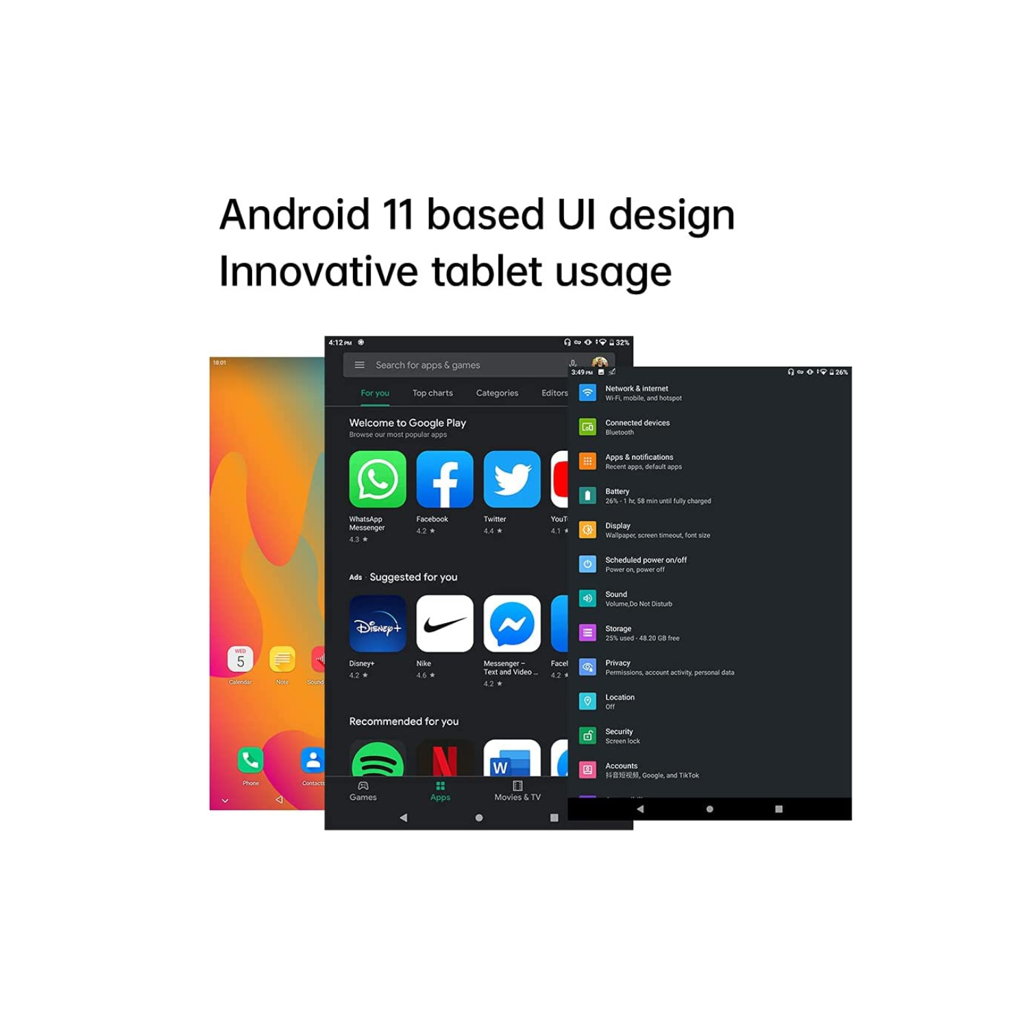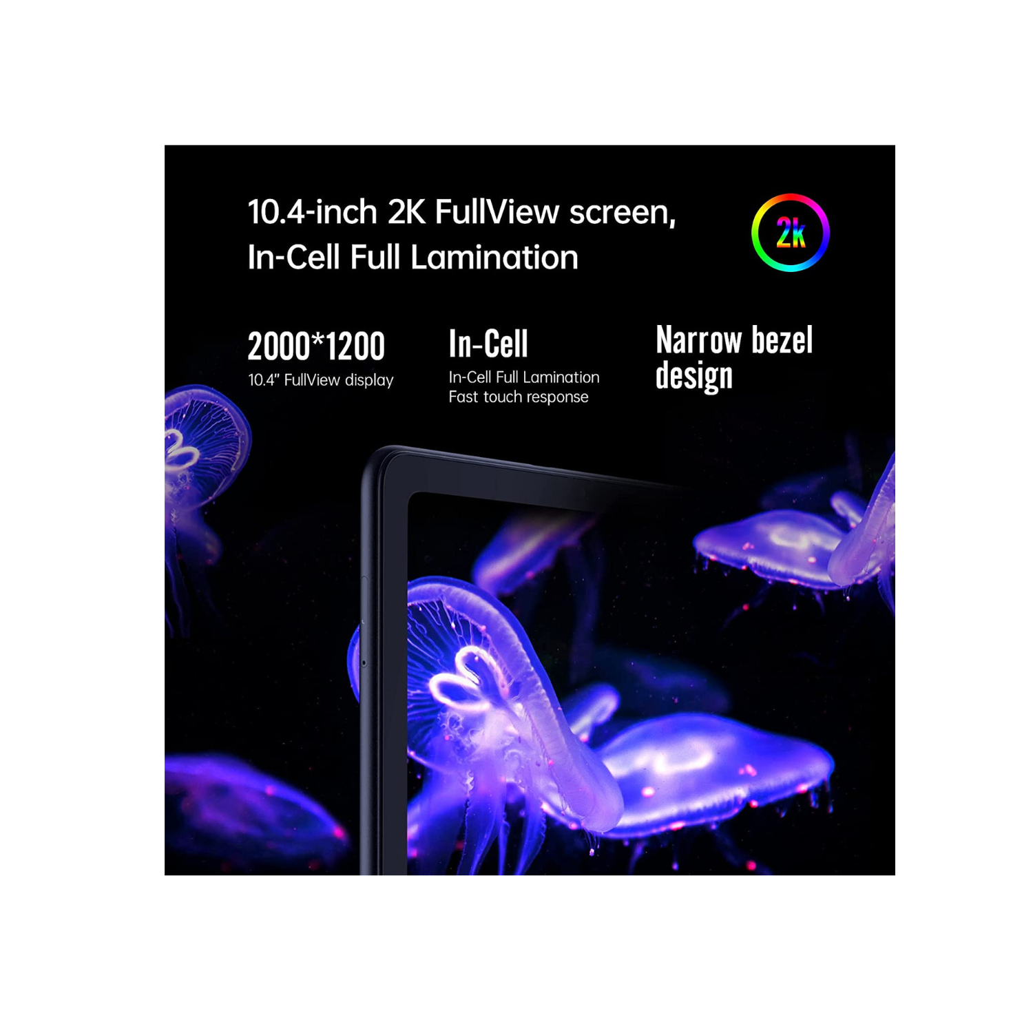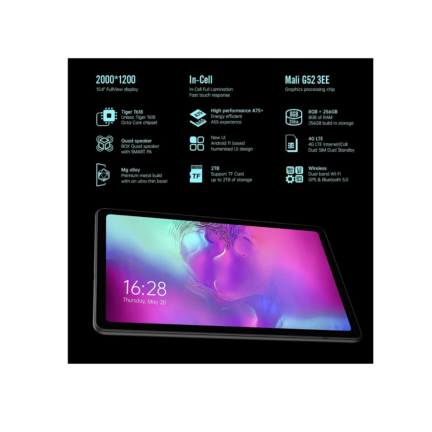 The ALLDOCUBE iPlay40 Pro is a high-performance Android tablet with the latest Android 11 OS and basic Google apps already installed. It features a 10.4-inch 2K display, a lightweight design, and 8 GB of RAM with a 64-bit octa-core processor. The tablet has a large storage capacity of 256 GB ROM and expandable storage up to 2TB. Additionally, it has a 6200 mAh lithium polymer battery for a long battery life of up to 10 hours and features Eye Health for a comfortable reading experience at night.