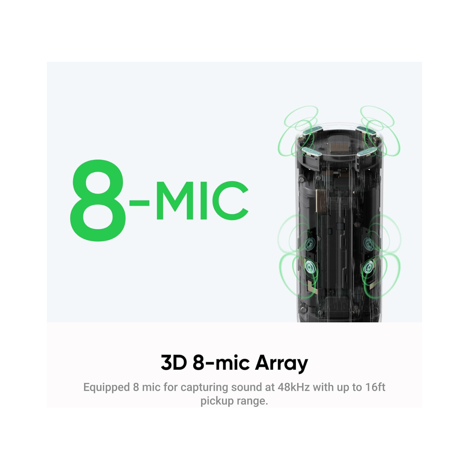 3D 8-Mic Array & 16ft Voice Pickup: Equipped with 8 microphones, Insta360 Wave captures voices up to 16 ft away at a 48kHz premium sampling rate.